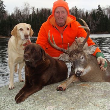 Erik was walking up to the stand on the portage. As he got closer he saw a doe in the bushes. A fork buck appeared and was looking for action. Then a crunch, a nice buck ran by and stopped broadside. Shot, over the ridge he went. Tim showed up, Erik saw the buck sneaking thru the bush, one more shot to harvest.